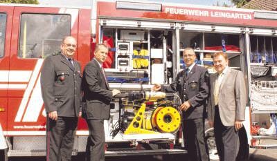 Gestärkt Alles Gute und wenige Einsätze wünschten der Mannschaft um André Göbl auch Kreisbrandmeister Uwe Vogel und Bruno Herbach von der Firma Schlingmann, die für den Fahrzeugaufbau verantwortlich ist. Mit dem neuen Wagen erfahren die Wehren des Landkreises eine Stärkung, stellte Vogel fest. Und es wird sicher zum Motivationsschub der Leingartener Wehr führen. Denn für die ehrenamtliche Arbeit brauche es neben Mut und Engagement auch eine gute Ausbildung und eine gute Ausrüstung, so der Kreisbrandmeister.