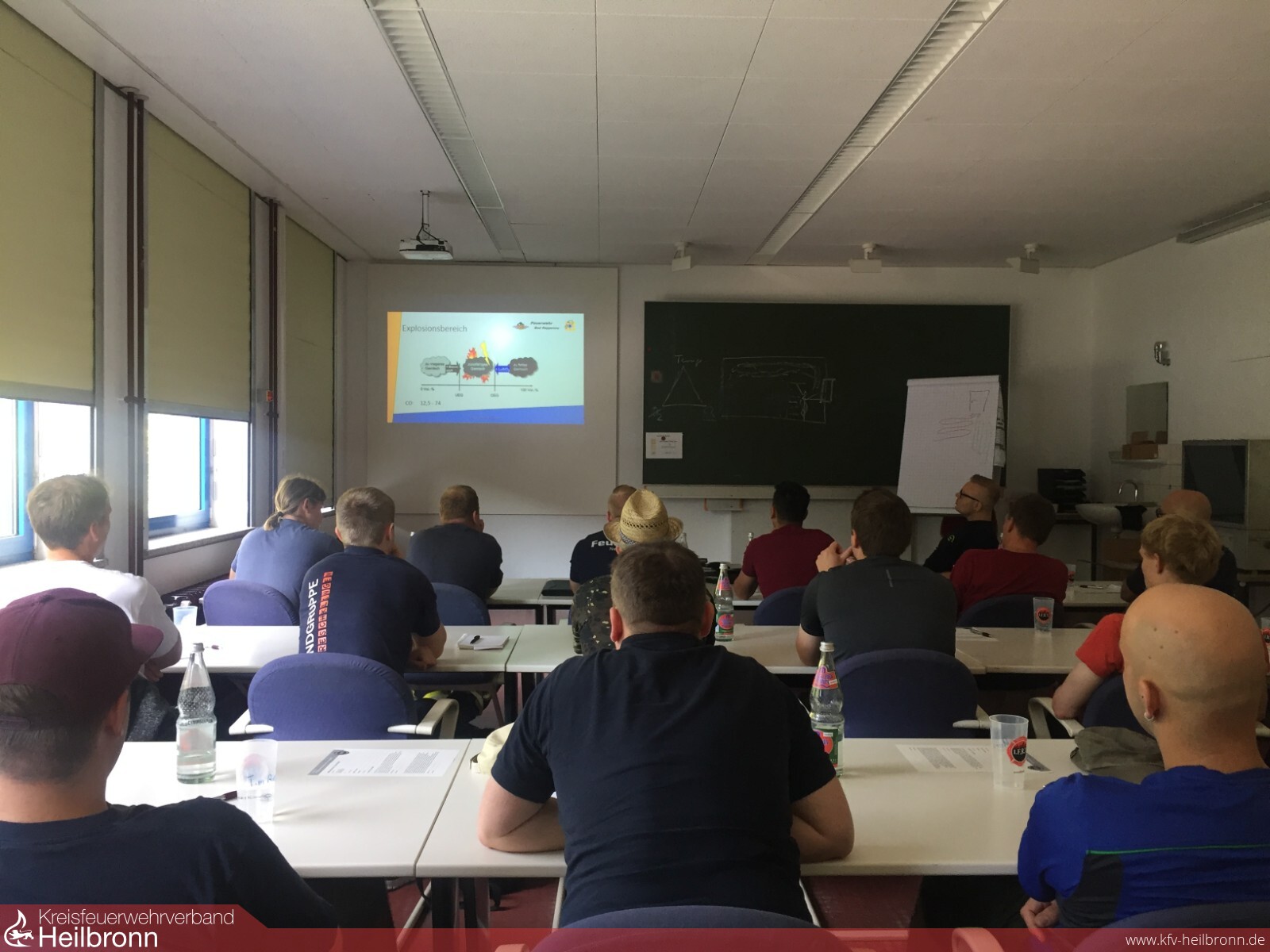 Nach der Ankunft um 8 Uhr, gab es für die Teilnehmer zuerst eine Führung durch die Räumlichkeiten des Hauptgebäudes. Danach fand man sich im Lehrsaal ein, in dem der theoretische Teil der Ausbildung stattfand. Den theoretischen Teil der Heißausbildung leiteten die Heißausbilder durch die Begrüßung ein, bei der besonders betont wurde, genug Flüssigkeit den Tag über zu sich zu nehmen, um bei den bereits hohen Außentemperaturen aber vor allem nach den Übungen unter Atemschutz hydriert zu bleiben. Mit Hilfe einer PowerPoint Präsentation, Bildern und Videomaterial wurde erläutert, welche Arten der Heißausbildung es gibt. Die Begriffe „Pyrolyse“ und „Thermisches Gleichgewicht“ sowie die Entstehung einer Raumdurchzündung (Flashover), Rauchschichtdurchzündung (Rollover) und die Rauchgasexplosion (Backdraft) wurden erklärt und veranschaulicht. Auch der richtige Umgang mit dem Hohlstrahlrohr und das korrekte Vorgehen bei der Türöffnungsprozedur wurde von Stefan Wegner erläutert. Währenddessen wurde auf dem Brandübungsgelände die Ausrüstung sowie einer der Brandcontainer vorbereitet. Am Ende der Präsentation wurde auf die Sicherheitshinweise eingegangen, die es im Einsatz zu beachten gilt und später auch im Brandcontainer einzuhalten waren.