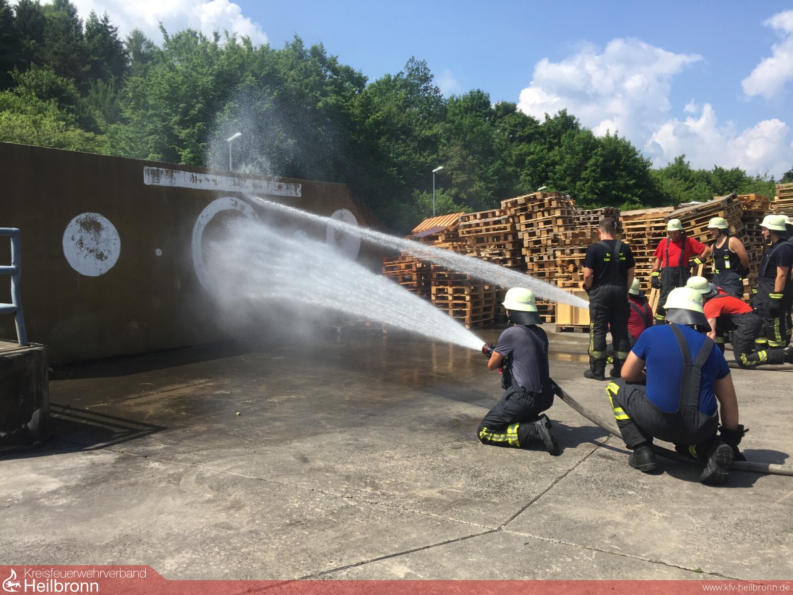 Im Anschluss an den theoretischen Teil nahm man gemeinsam ein Frühstück ein. Gegen 10 Uhr hieß es für die Kameraden umgezogen auf dem Platz der Brandübungsanlage bereit zu sein. Dort fanden sich alle nochmal zu einer kurzen Besprechung zusammen. Geschlossen ging es in einen der Container, um das richtige Verhalten und die Kommandos der Heißausbildern zu verdeutlichen. Zurück auf dem Platz der Brandübungsanlage mussten alle Atemschutzgeräte überprüft und angelegt werden. Erstmal ging es für die Kameraden in einen der einzelnen Brandcontainer, vorher wurde jeder Auszubildende nochmal überprüft. Im ersten Durchgang hieß es für alle zuschauen und aufpassen. Ihnen wurde eine Rauchschichtdurchzündung (Rollover) veranschaulicht und wie man sie verhindert. Ebenso konnte durch den entstehenden Rauch (dank Feststoffbefeuerung Holz) in diesem Durchgang sehr gut demonstriert werden, welche Bedeutung dem Verhältnis von Zu- und Abluftöffnung beigemessen werden sollte. In Durchgang zwei teilte man in zwei Gruppen auf. Eine der Gruppen begann mit einem Strahlrohr-Training auf dem Platz der Brandübungsanlage, während dessen die andere Gruppe zurück in den Brandcontainer ging um selbst einmal Hand an zu legen. Es galt mit Sprühstößen eine Rauchgasdurchzündung zu verhindern, um die Auswirkungen einer Raumdurchzündung (Flashover) zu verringern. Das Strahlrohr-Training leitete Heißausbilder Julian Kober, er besprach in den Gruppen die Durchflussmenge des Hohlstrahlrohrs und die richtige Handhabung. Auf dem Übungsgelände befanden sich an einer Mauer aufgemalte Formen, welches es galt im Strahlwechsel zu treffen. Danach tauschten die Gruppen.