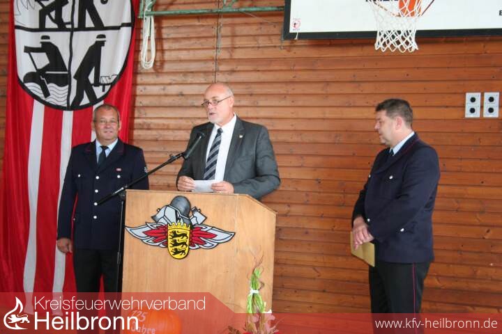 Rolf Weiss, der langjährige Abteilungskommandant und jetzige Zugführer der Altersabteilung, ging auf die Geschichte der Abteilung ein, die Gründung, bei der jeder zur Feuerwehr mußte, der fähig war, immerhin 60 Männer bei einer Gesamtbevölkerung von 300 Personen. Auch die sehr spärliche Ausrüstung, denn erst ab 1890 gab es Handpumpspritzen und ab 1920 motorgestütze Pumpen. Die Alarmierung erfolgte über die Kirchenglocken. Weiter berichtete er vom zu 80 % zerstörten Degmarn, bei dem in den letzten Kriegstagen auch das Rathaus ausbrannte und alle Unterlagen vernichtete. Seinen Vorgängern als Kommandant und ab 1971 als Abteilungskommandant und nun nach ihm seinem Nachfolger Uli Mann bestätigte er eine gute Verbindung zur Gemeinde unter Bürgermeister August Horch, Karl Hehn, Manfred Ley und heute Ulrich Ruoff.