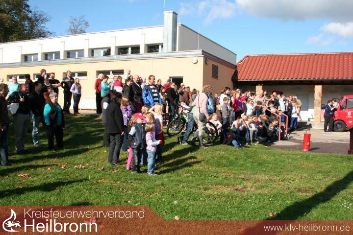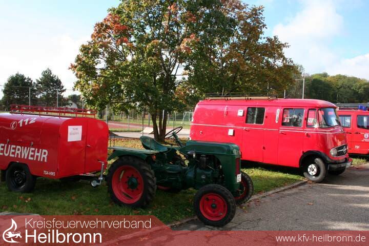 Im Außenbereich der Halle empfingen die bisherigen Fahrzeuge der Abteilung Degmarn, der handgezogene Einsatzkarren, der schleppergezogene Tragkraftspritzenanhänger TSA und das derzeitige TSF sowie das erste motorisierte Oedheimer Löschgruppenfahrzeug LF 8 aus dem Jahre 1961 und das künftige Degmarner LF 8 die sehr zahlreich erschienenen Besucher und Gäste.