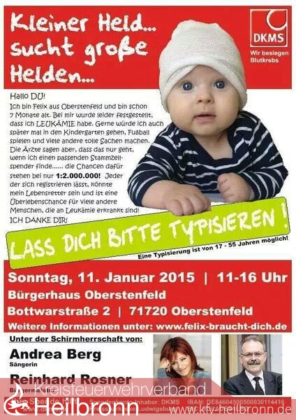 Die Suche nach geeigneten Spendern war in den letzten Tagen in verschiedenen Medien beworben worden. Wir wünschen den Angehörigen und dem erkrankten Felix viel Glück, das durch diesen Aktionstag, unterstützt durch die DKMS (Deutsche Knochenmarkspenderdatei), in Oberstenfeld ein geeigneter Spender gefunden werden konnte.
