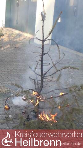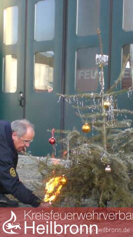 Um zu demonstrieren, wie groß die Feuergefahr ist „und um die Leute vorsichtiger zu machen", sind die Feuerwehrleute im Hof ihrer Heilbronner Leitzentrale selbst zu Brandstiftern geworden. Denn, so Baumann, „die Leute denken immer, ein Baum brennt halt. Aber wie der brennen kann, das wissen die meisten nicht." Um Echtbedingungen zu schaffen, opferten die Retter sogar eigene Christbaumkugeln und Lametta, mit denen sie die Test-Christbäume schmückten. Die Nadelgehölz-Probanden waren Spenden von Baumärkten und Vereins-Weihnachtsfeiern.