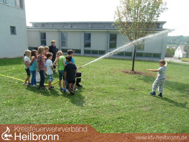 Im Schulhof warteten Katharina Wagner, Daniel Röckel, Otto Schropp, Jochen Waldenberger und Sebastian Witt auf die Schüler. Hier wurden Ausrüstungen erklärt und praktische Übungen durchgeführt. So durfte jeder mal ein Strahlrohr führen, was im einen oder anderen Fall auch zur Abkühlung der Mitschüler führte.