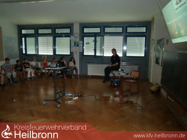 In einem Unterrichtsraum erklärte Carolin Bauer grundsätzliches zum Thema Feuerwehr. Welche Arten der Feuerwehr gibt es? Wie läuft die Alarmierung der Feuerwehr? Aber auch kleine Filmchen hatte sie im Gepäck. So sahen die Kinder einen Flash-Over und die Entwicklung eines Brandes an einem Weihnachtsbaum.