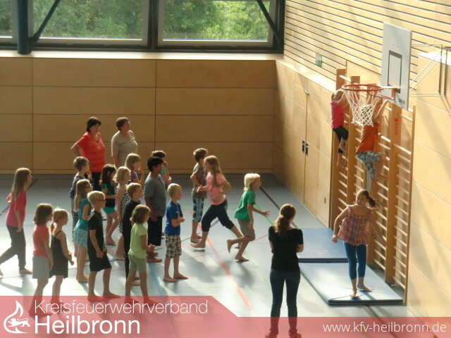 In der Sturmfeder-Halle wurde, unter Anleitung von Lehrkräften der Schule, die Förderung von Wasser in einer Eimerkette, mittels Bällen, ausprobiert. Außerdem das Leitersteigen an der Sprossenwand.