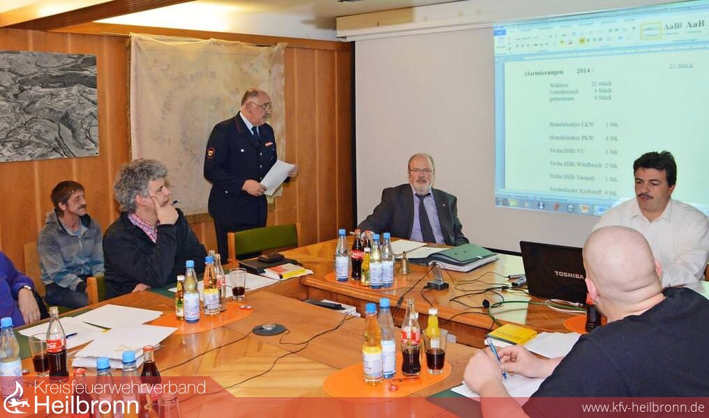 Bild: Wolfgang Schlägel (stehend) berichtet über die Einsätze der Wehr und bekam den Dank des Rats und von Bürgermeister Jürgen Olma (3.v.r.). (Foto: Rudolf Landauer)