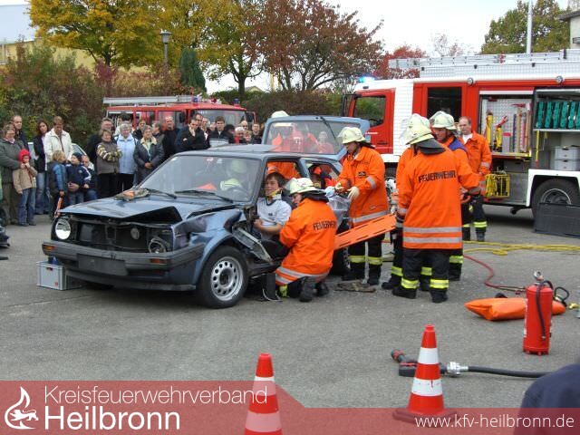 Bild 1: von links Bürgermeister Björn Steinbach, Vorsitzender Gewerbeverein Rainer Schweikert, Kommandant Thomas Oeckler und vom ASB Heilbronn Roland SchmittBild 2: Gerätschaften zur technischen RettungBild 3: Kommandant Thomas Oeckler und Roland Schmitt ASB HeilbronnBild 4: Schauübung „Verkehrsunfall"Bild 5: Schauübung „Löschangriff"