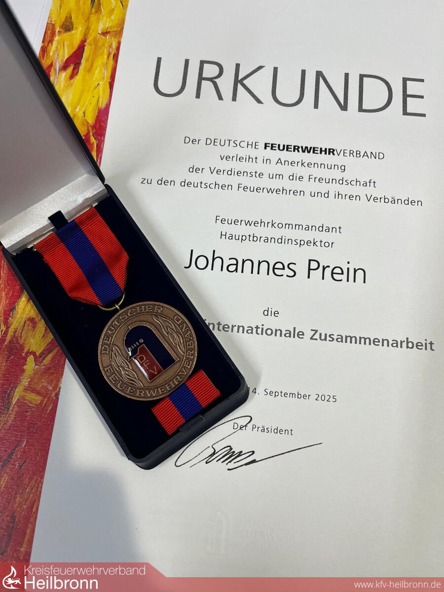 Eine besondere Ehre war es Kommandant Johannes Prein die Medaille für internationale Zusammenarbeit in Bronze des Deutschen Feuerwehrverbandes verleihen zu dürfen. Diese besondere Auszeichnung ist für Personen bestimmt, welche sich über Jahre hinweg um die Freundschaft zu den deutschen Feuerwehren und Ihren Verbänden verdient gemacht haben. Bereits seit fast 20 Jahren ist Johannes Prein ein Förderer der Beziehung zwischen den beiden Feuerwehren.