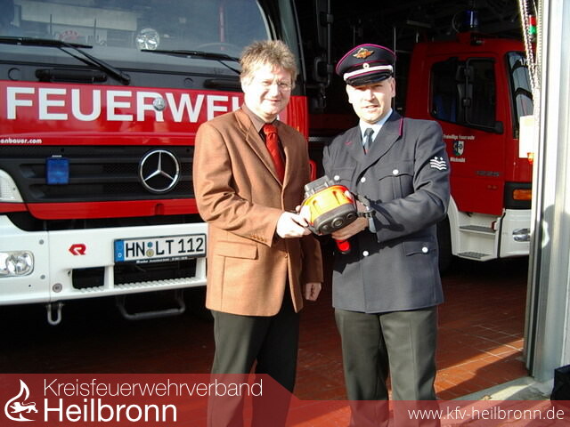 Bild 2: Bürgermeister Ulrich Stammer und Feuerwehrkommandant Uwe Thomafreuen sich sehr über die gestiftete Wärmebildkamera.