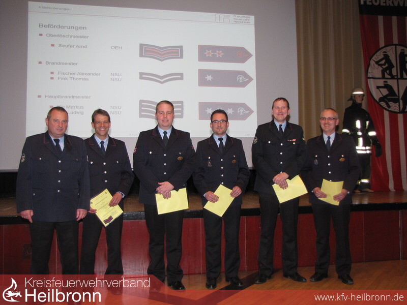 Auf der Jahreshauptversammlung der Feuerwehr Neckarsulm beförderte Kommandant Wolfgang Rauh (li.) die Feuerwehrmänner (v. li.) Arnd Seufer, Alexander Fischer, Thomas Fink, Markus Kiy und Ludwig Zoll.