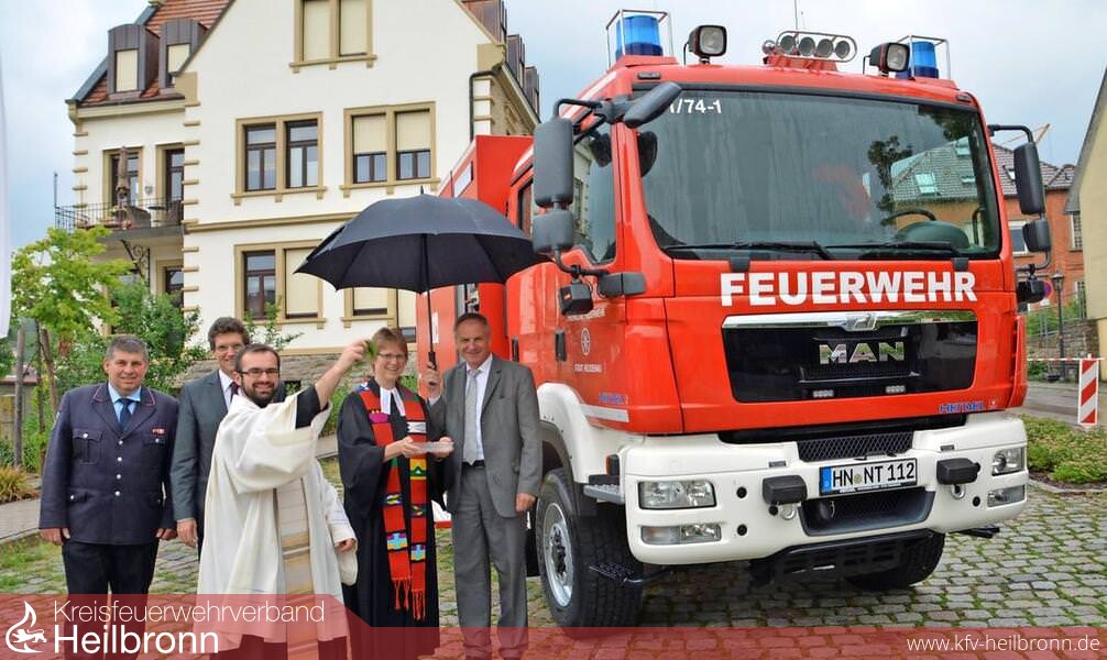 Pater Adam und Pfarrerin Susanne Spöhrer sprachen Gebete und Fürbitten für das Feuerwehrhaus, die Pater Adam mit der Gitarre begleitete. Im Regen wurde dann der GWL2 gesegnet und an Kommandant Jörg Wagner und damit seiner Bestimmung übergeben.