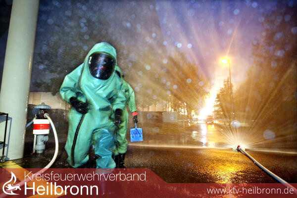 Ihre Mission ist ernst, und in ihren grünen Chemikalien-Schutzanzügen sehen sie ein bisschen aus wie Astronauten. Auf dem Gelände des Heilbronner EnBW-Kohlekraftwerks bahnen sich die zwei Feuerwehrmänner mit einer Werkzeugkiste in der Hand langsam ihren Weg zu einem Waggon, an dem Ammoniak austritt.