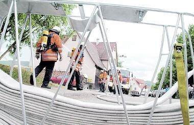 Foto: Ihre Einsatzfähigkeit stellte die Beilsteiner Feuerwehr bei einer Schauübung in Schmidhausen unter Beweis. Das Feuerwehrfest am Wochenende war gut besucht. (Foto: Werner Kuhnle)