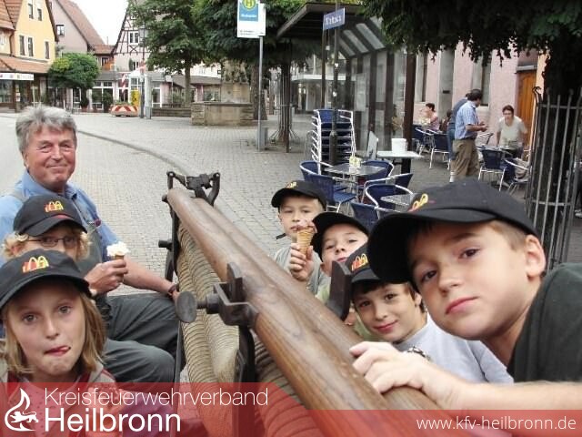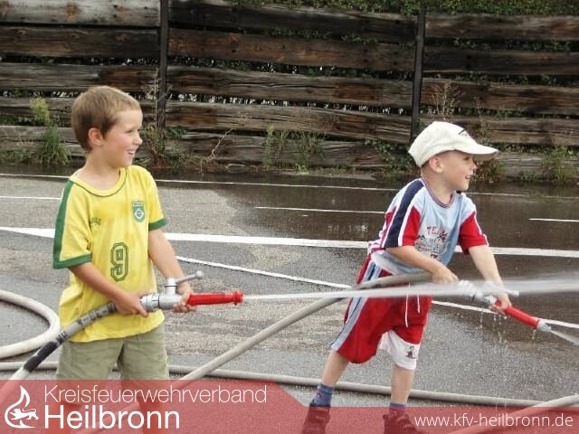 Am Samstag darauf konnte Feuerwehrkommandant Albert Decker 30 Kinder im Feuerwehrhaus bei der Aktion „Spiel und Spaß bei der Feuerwehr“ begrüßen. Nach der Einstimmung auf das Thema Feuerwehr mit einem Film, wurde dieses anschaulich an den Feuerwehrfahrzeugen und Ausrüstungsgegenständen vertieft. Anschließend erwartete die Kinder ein von den Steffen Dennewill und Uwe Schlund vorbereiter Spielparcours, bei dem das „Hauptlöschmittel“ Wasser dominierte. Natürlich blieb dabei so manches T-Shirt und Hose nicht trocken. Die Kameraden des Alterszugs um Werner Kümmerle sorgten mit einer an einem alten Traktor abgehängten historischen Spritze für Abwechslung, indem sie damit eine Rundfahrt durch die Innenstadt von Schwaigern anboten. „Wer so viel erlebt, der hat auch ordentlichen Hunger“, dachten sich die Feuerwehrmänner und verabschiedeten die Kinder gebührlich mit einem Grillvesper.