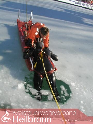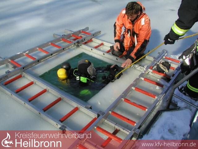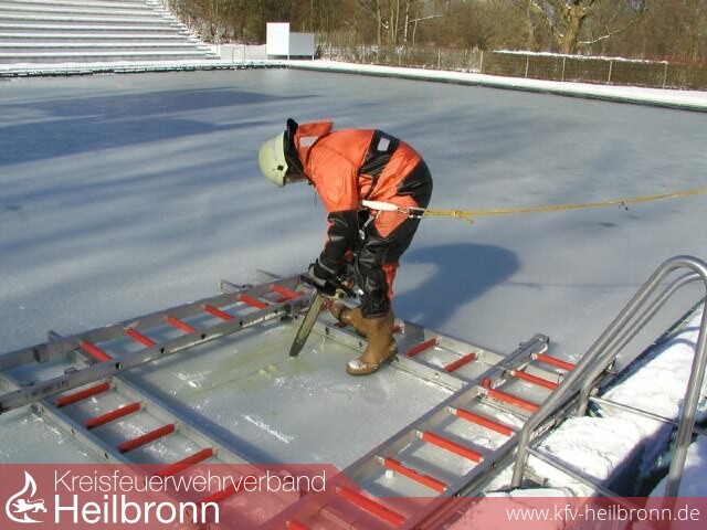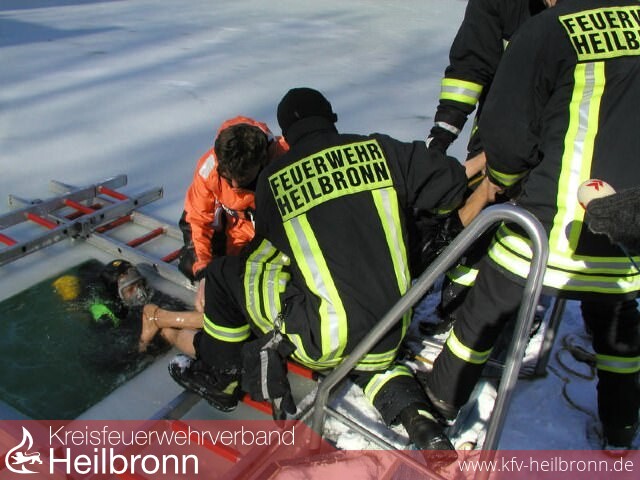 Wie schnell kann ein Mensch, der auf einem See einbricht, gerettet werden? Die Tauchergruppe der Heilbronner Berufsfeuerwehr gab gestern eine klare Antwort. Im Neoprenanzug gleitet Frank Zimmermann in das Eisloch, das die Feuerwehr am Morgen im Freibadbecken geschlagen hat. Er ist das Opfer, er soll gerettet werden, wenn Kollege Timo Fritsche gleich mit dem Rettungsboard anrückt.