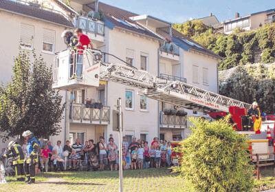 Gekonnt und sicher steuert Feuerwehrmann Simon Moser das große, schwere und vor allem lange Drehleiterfahrzeug auf dem schmalen und kurvigen Zufahrtsweg zum Seniorenzentrum \"Haus Edelberg\". Dort wartet schon eine große Zuschauerschar auf die Feuerwehr und ihre angekündigte Jahreshauptübung. Im Rollstuhl sitzend oder mit dem Rollator unterwegs haben sich die noch Rüstigen unter den Hausbewohnern rechtzeitig einen schattigen Beobachtungsplatz gesichert.