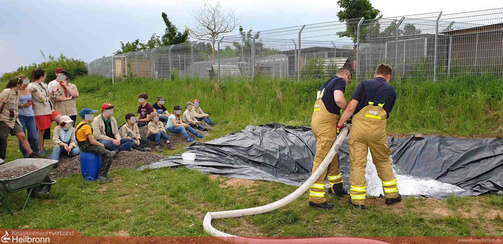Im Rahmen der 72 Stunden Aktion des KoKreis Heilbronn unterstützte die Feuerwehr Heilbronn am Samstagnachmittag die Pfadfinderschaft Heilbronn bei der Befüllung eines Teiches. Bei der Aktion wurde ein ca. 25 qm großes Loch ausgehoben, mit einer Teichfolie ausgelegt und danach von der Feuerwehr mit Wasser befüllt. Zu Gute kommt dieser Teich den Tieren des Tierheimes Heilbronn, welches hierfür einen Teil einer Wiese bereitstellte.