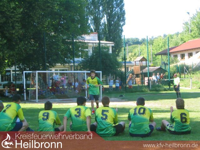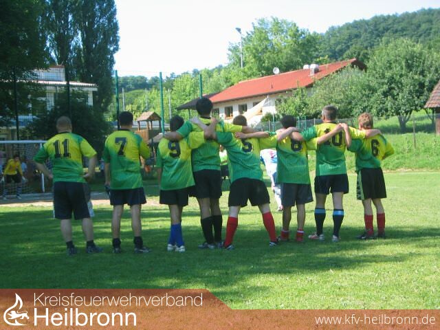 Acht Fußballmannschaften hatten sich zu diesem Turnier angemeldet und wurden in zwei Gruppen aufgeteilt. Dass sich die Mannschaft der Feuerwehr in der stärksten Gruppe befand, stellte sich schnell heraus, denn von den vier Mannschaften der eigenen Gruppe waren später zwei im Endspiel um den 1. Platz. Doch man schlug sich gut. Nachdem die Floriansjünger das erste Spiel mit 1:5 verloren hatten (der Gegner in diesem Spiel hatte bei diesem Turnier den 1. Platz erringen können!) begann die anstrengende Aufholjagd. Es folgte ein 3:3 unentschieden gegen die nächsten Gegner, die sehr viel Mühe hatten, an den Abwehrspielern der Feuerwehr vorbeizukommen. Mit Abstand das spannendste Spiel war für die Teilnehmer der Sportgruppe das letzte Spiel um Platz 7. Die Fußballer der Sportgruppe lagen bis zur 9. Spielminute mit 0:2 hinten, als durch Tore von Heiko Frank und Achim Demele der Ausgleich zum 2:2 fiel. In anschließendem, spannenden 9-Meter schießen konnte sich der Torwart der Feuerwehr mit einigen Glanzparaden durchsetzen und brachte die Mannschaft somit auf den siebten Platz.
