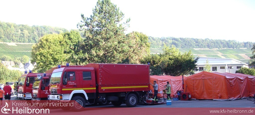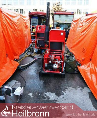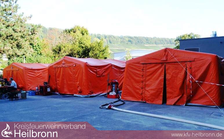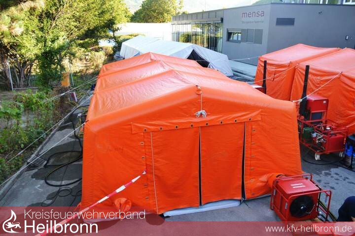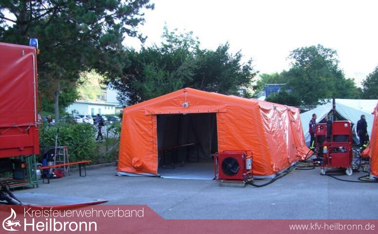 Bereits am Samstagmorgen fand der Aufbau am Schulgelände in Niedernhall statt. Alle drei Feuerwehren bauten ihre Dusch- und Aufenthaltszelte auf. Hinzu kamen noch zwei Umkleidezelte der Feuerwehr Öhringen. Nachdem unzählige Schläuche und Armaturen miteinander verbunden, das Warmluftgebläse und die Warmwasseraufbereitung aufgebaut waren, konnte ein erster Testlauf stattfinden. Fachbereichsleiter Jochen Wengert war mit dem Ergebnis mehr als zufrieden.