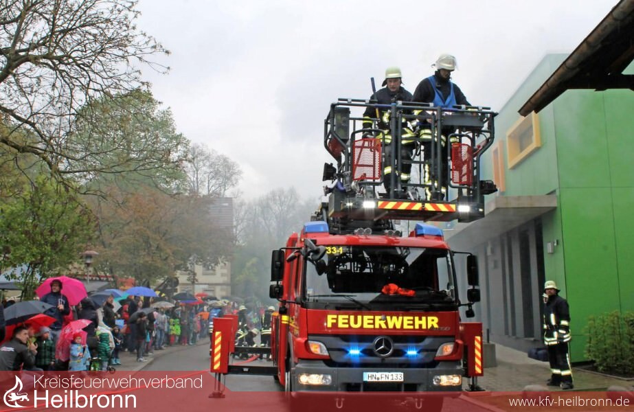 Rauchschwaden dringen aus der Kindertagesstätte im Mühlweg in Neuenstadt. In der Ferne sind mehrere Martinshörner zu hören, mehr als 100 Zuschauer aller Altersgruppen warten trotz strömenden Regens, bis die Einsatzkräfte eintreffen. Wie immer ist das Interesse groß, wenn die Freiwillige Feuerwehr Neuenstadt eine Großübung im Programm hat.