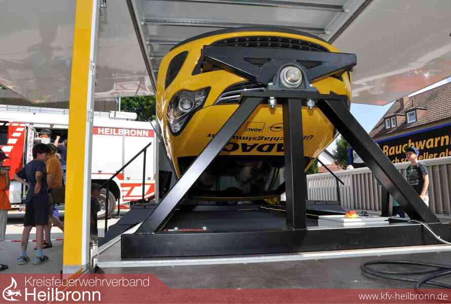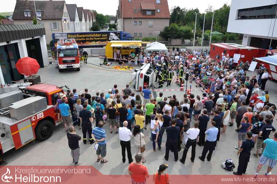 „Absitzen“!, ruft Christian Stolz mit militärischem Unterton über den Innenhof der Heilbronner Feuerwehr. Sekunden später springt der acht Mann starke Rettungstrupp aus dem Einsatzfahrzeug. Der Gruppenführer inspiziert die Unfallstelle, während die Kollegen die Bergung und Versorgung der verunglückten Personen im umgekippten BMW vorbereiten. Zack, zack geht das, jeder weiß ganz genau, was er zu tun hat, die Aufgaben sind klar verteilt, wie Stolz, Ausbilder bei der Freiwilligen Feuerwehr Heilbronn, dem interessierten Publikum erläutert.