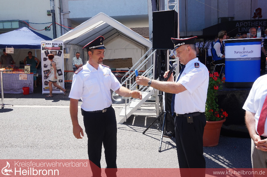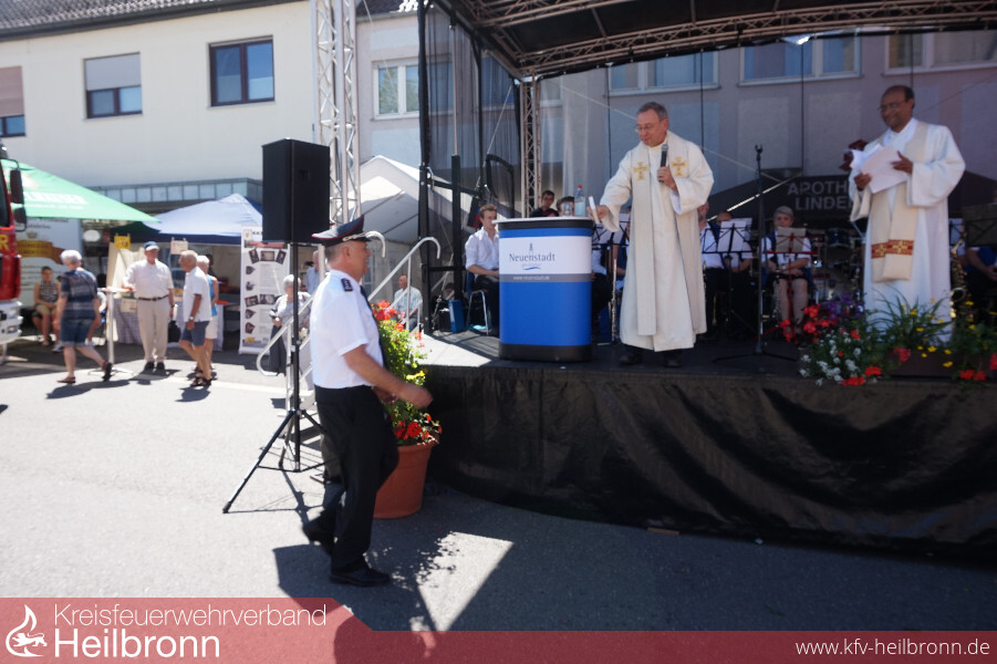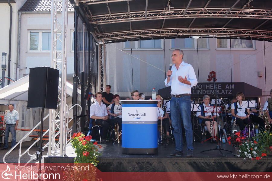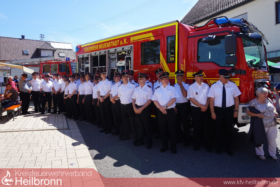 Zur Fahrzeugübergabe auf dem Lindenplatz waren neben dem stellvertretenden Kreisbrandmeister Uwe Thoma, viele Feuerwehren aus dem Bezirk IV (Neuenstadt-Möckmühl) und Nachbarfeuerwehren erschienen. Aus der Politik kam der Landtagsabgeordnete Dr. Bernhard Lasotta. Auch einige Mitglieder des Gemeinderats und der Stadtverwaltung ließen es ich nicht nehmen, bei dieser wichtigen Investition in Richtung Sicherheit und Gefahrenabwehr für die Bürger und Besucher unserer Stadt, dabei zu sein. Neben vielen Feuerwehrangehörigen, nahm auch die Bevölkerung großen Anteil an der Übergabe an einem strahlend blauen Frühsommertag.