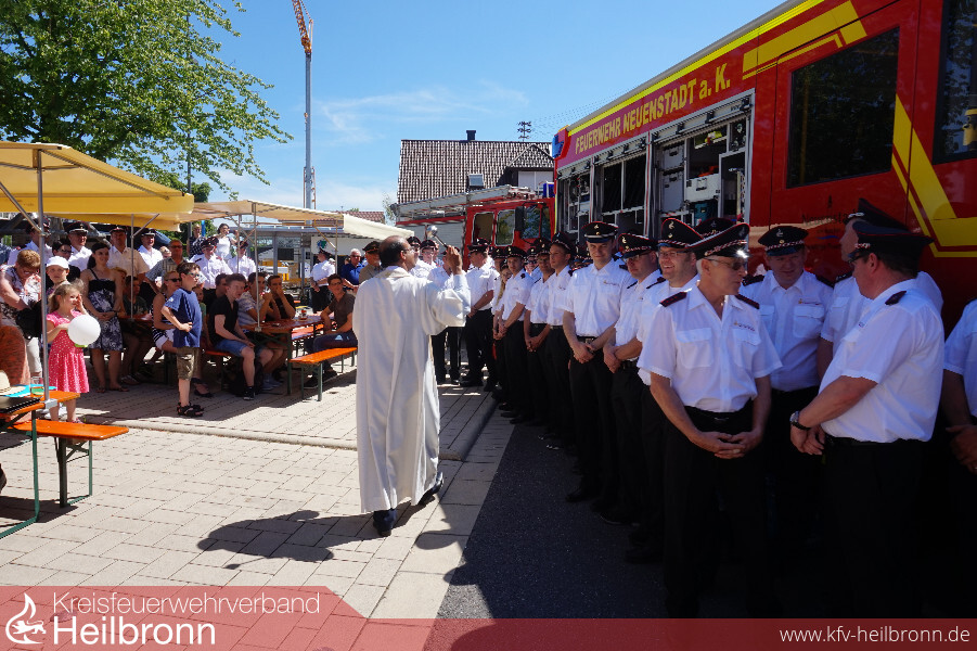 Zu Beginn wurden die Mitglieder der Feuerwehr gesegnet und das neue Löschfahrzeug durch Dekan Mack und Pfarrer Mundenkurian geweiht. Für Dekan Mack ist es nicht selbstverständlich das Bürger sich freiwillig in den Dienst der Feuerwehr stellen. Er übergab der Feuerwehr eine Bibel in einem Wasserfesten Einband als Begleiter auf dem neuen Fahrzeug.