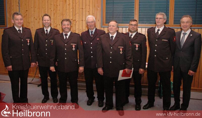 Für 40 Jahre wurden Werner Eberlen aus Botenheim und Peter Kruttschnitt aus Meimsheim geehrt. Auf eine 25-jährige Dienstzeit zurückblicken können Andreas Wulle (Brackenheim), Peter Buyer (Botenheim), Hans Wagner-Keiner (Neipperg), Bernd Kurz (Hausen) und Kommandant Peter Hügle.
