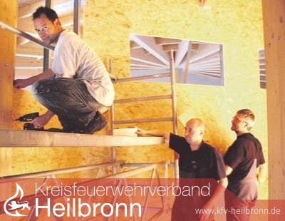 Bild: Selbst errichten die Feuerwehrmänner die Innenwände im Verwaltungs- und Aufenthaltsbereich ihres neuen Dienstgebäudes. (Foto: Ute Plückthun)
