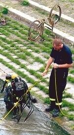 Auf den ersten Blick sind nur die gelben Seile zu sehen, die von Signalmännern am Ufer und auf der Brücke gehalten werden. Nach ein paar Minuten tauchen die gelben Sauerstoffflaschen und die dazugehörigen Männer aus dreieinhalb Meter Tiefe wieder auf - mit einem Wäscheständer, den Überresten eines Motorrads oder einem Kickroller in den Händen. Wegen der Zweiräder wird die Polizei alarmiert, die die Rahmennummern mit denen von gestohlen gemeldeten Rädern vergleicht. Den Unrat entsorgt später das städtische Betriebsamt.