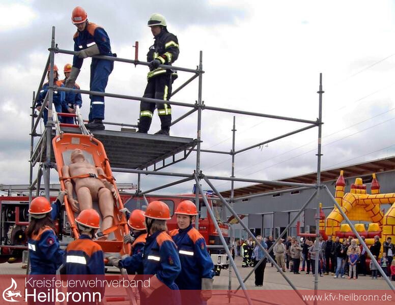 Die eingesetzten Mitglieder der Jugendfeuerwehr waren dieses Mal nicht mit dem Leitungsbau oder dem Löschen von Bränden beschäftigt, sondern mit der fiktiven Rettung von Menschenleben. Auf einem Schaugerüst lag eine Menschenpuppe, die es aus knapp drei Meter Höhe zu retten und danach medizinisch zu versorgen galt. Mit der Steckleiter wurde der Höhenunterschied überwunden, die Übungspuppe fachmännisch in einen Rettungskorb gehievt, dann über die Leiter abgeseilt und den Helfern des DRK-Ortsvereins Brackenheim zur weiteren Behandlung übergeben. Anerkennender Beifall der Besucher war der verdiente Lohn für den Feuerwehrnachwuchs.