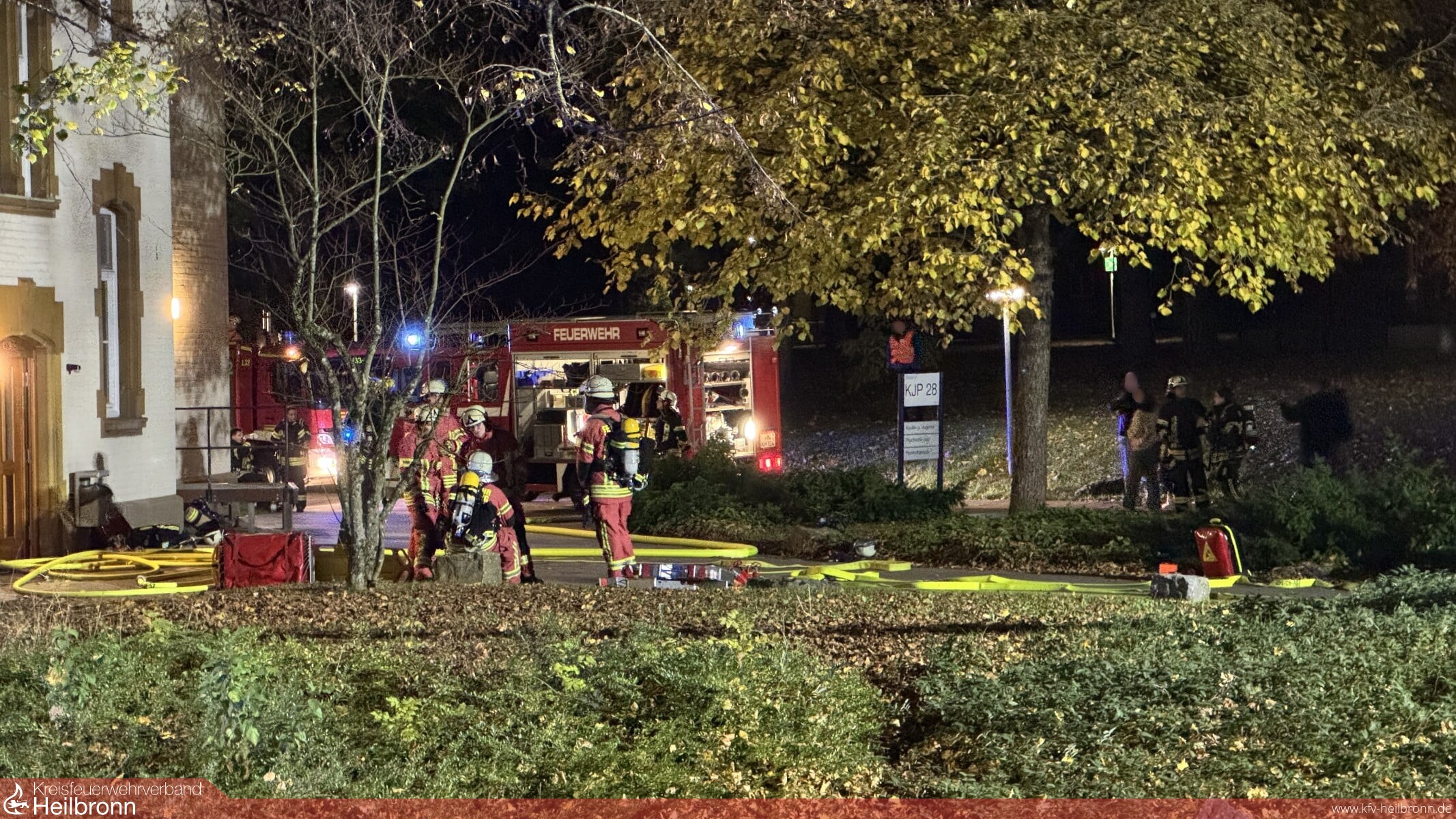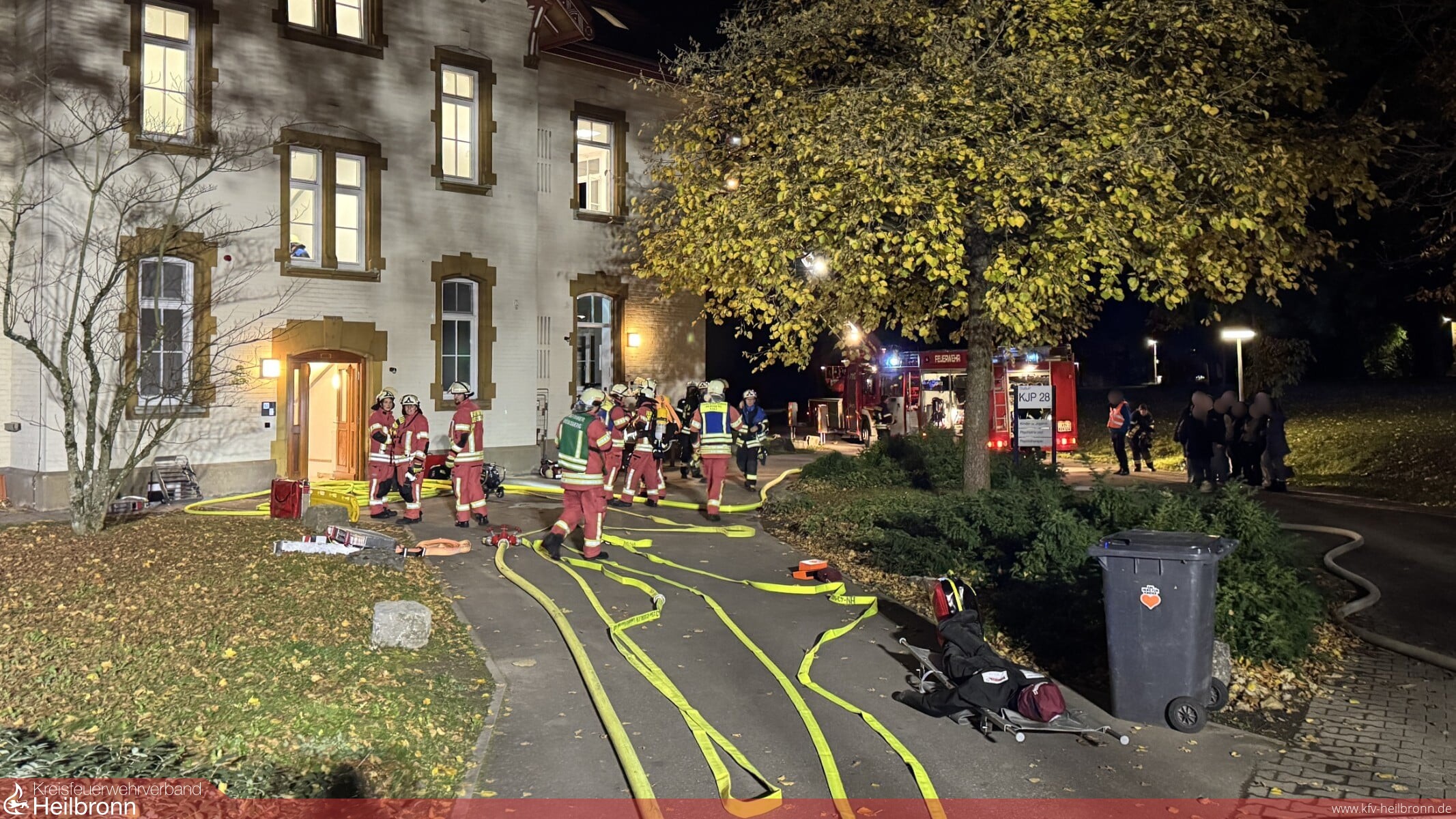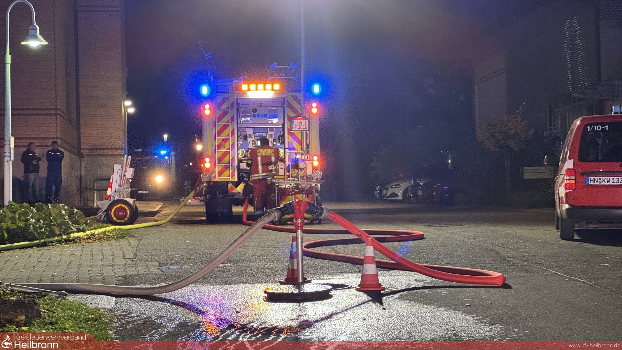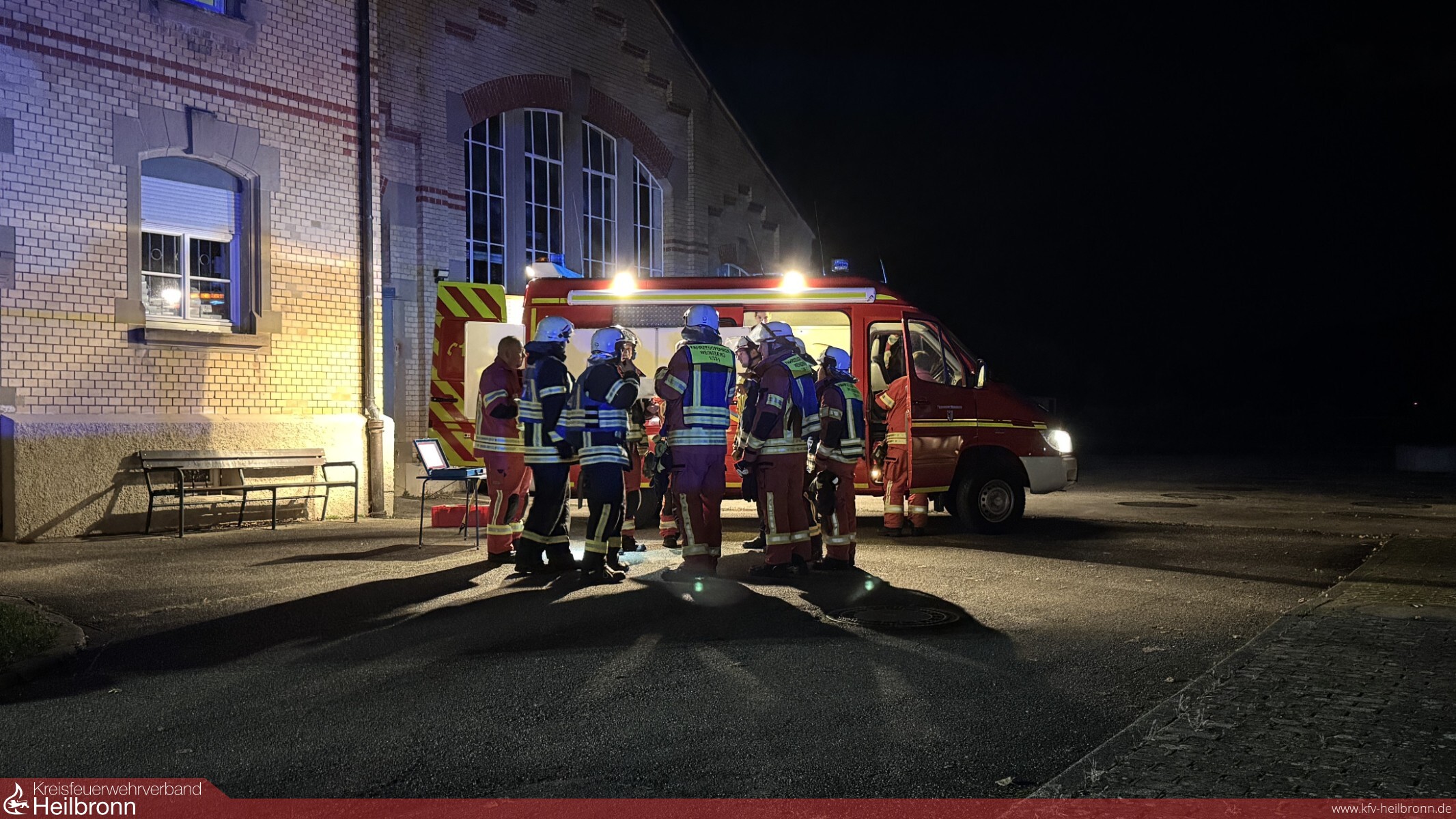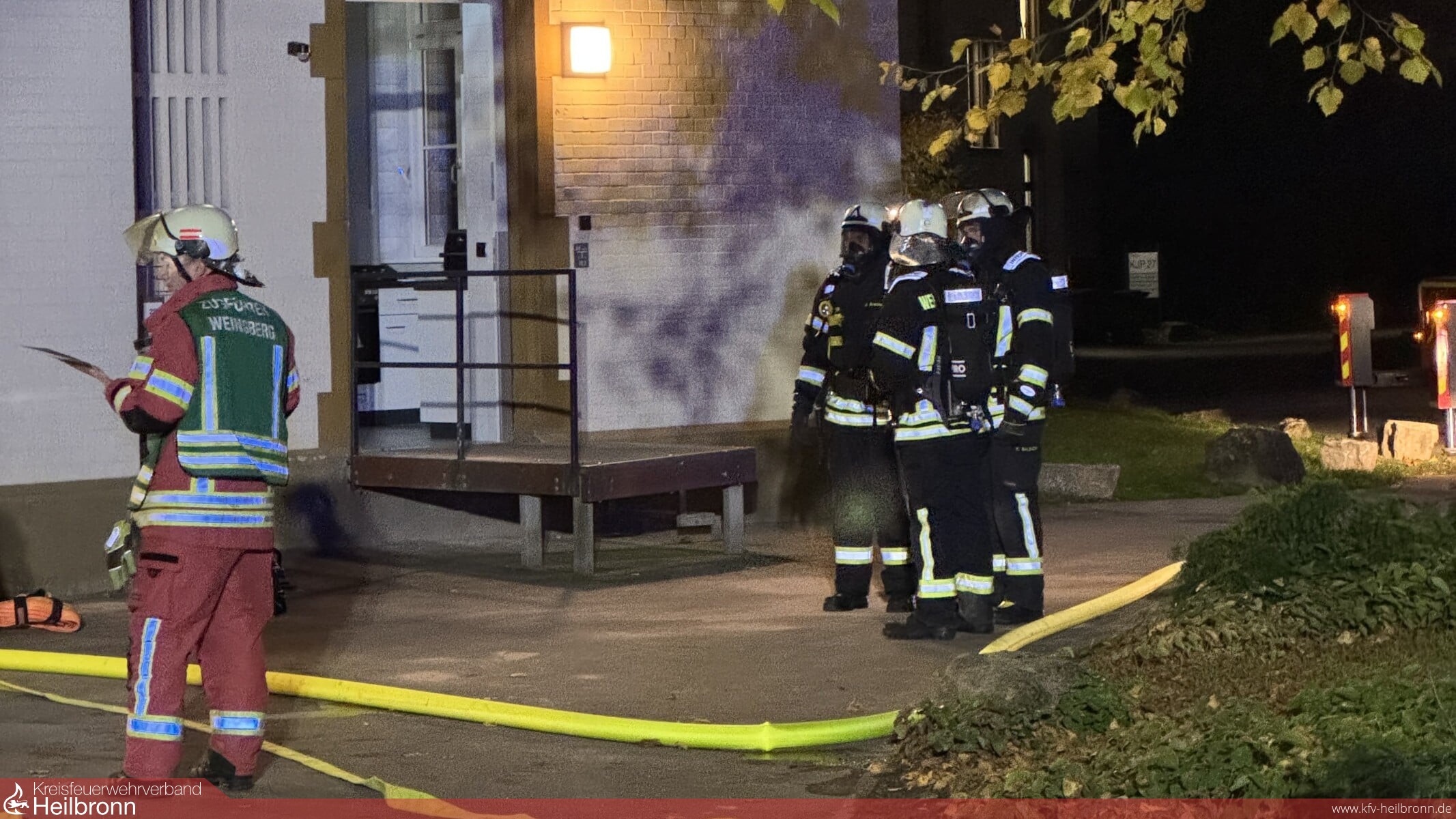 Die Werkfeuerwehr entsandte umgehend ihren Angriffstrupp zur Brandbekämpfung und Menschenrettung in den Keller, während Trupps der Feuerwehr Weinsberg die Obergeschosse nach weiteren Personen durchsuchten. Aufgrund der starken Verrauchung im Treppenhaus mussten mehrere Personen über die Drehleiter der Feuerwehr Weinsberg gerettet werden. Im Keller konnte der Angriffstrupp eine brennende Waschmaschine als Brandursache feststellen und das Feuer schnell löschen. Nachdem alle vermissten Personen in Sicherheit gebracht und der Brand vollständig gelöscht waren, wurde die Übung erfolgreich beendet.