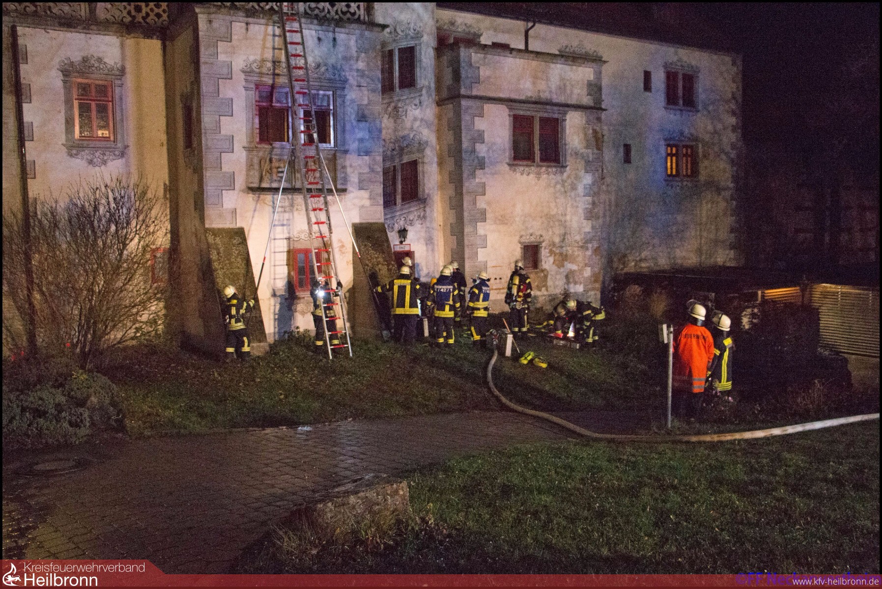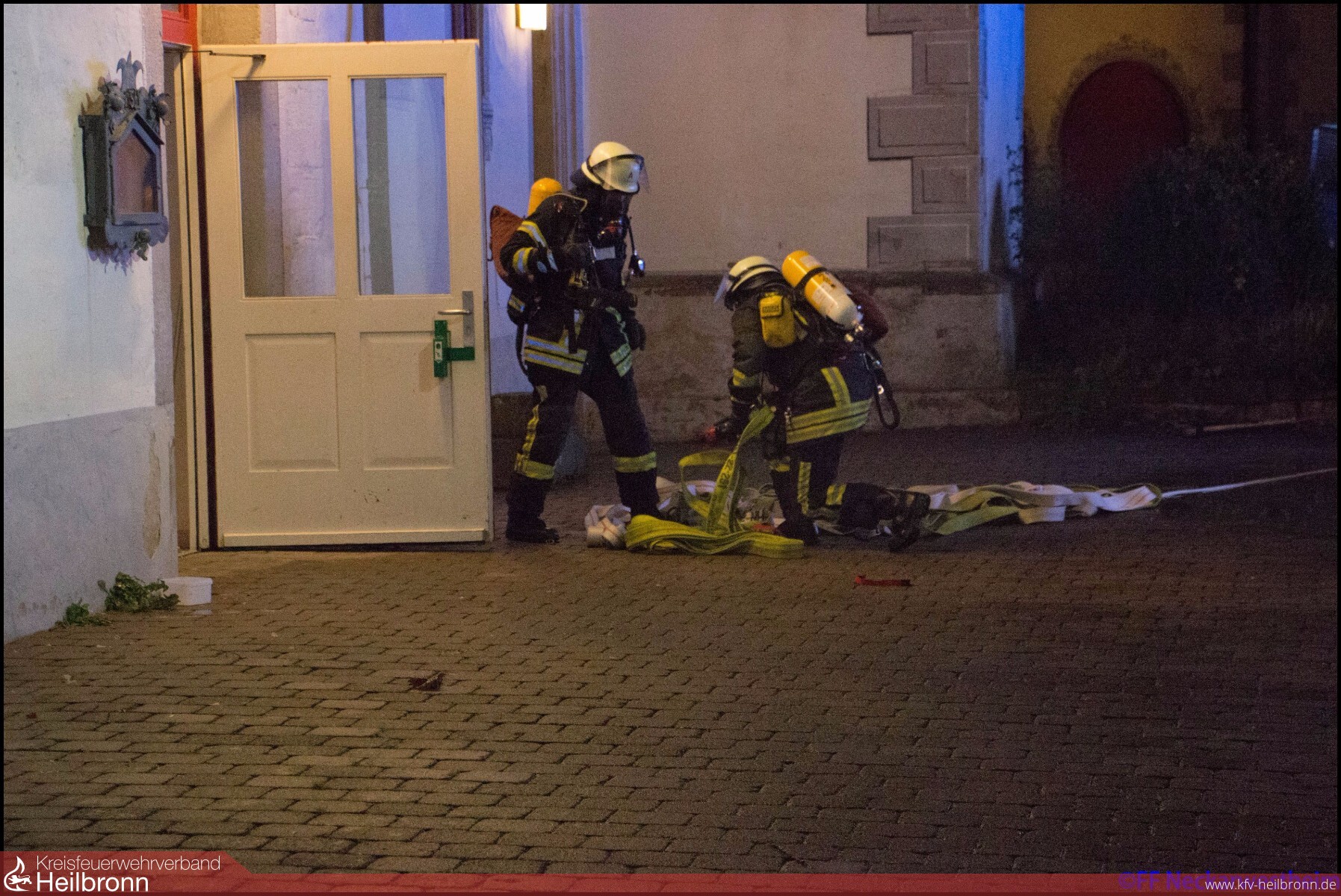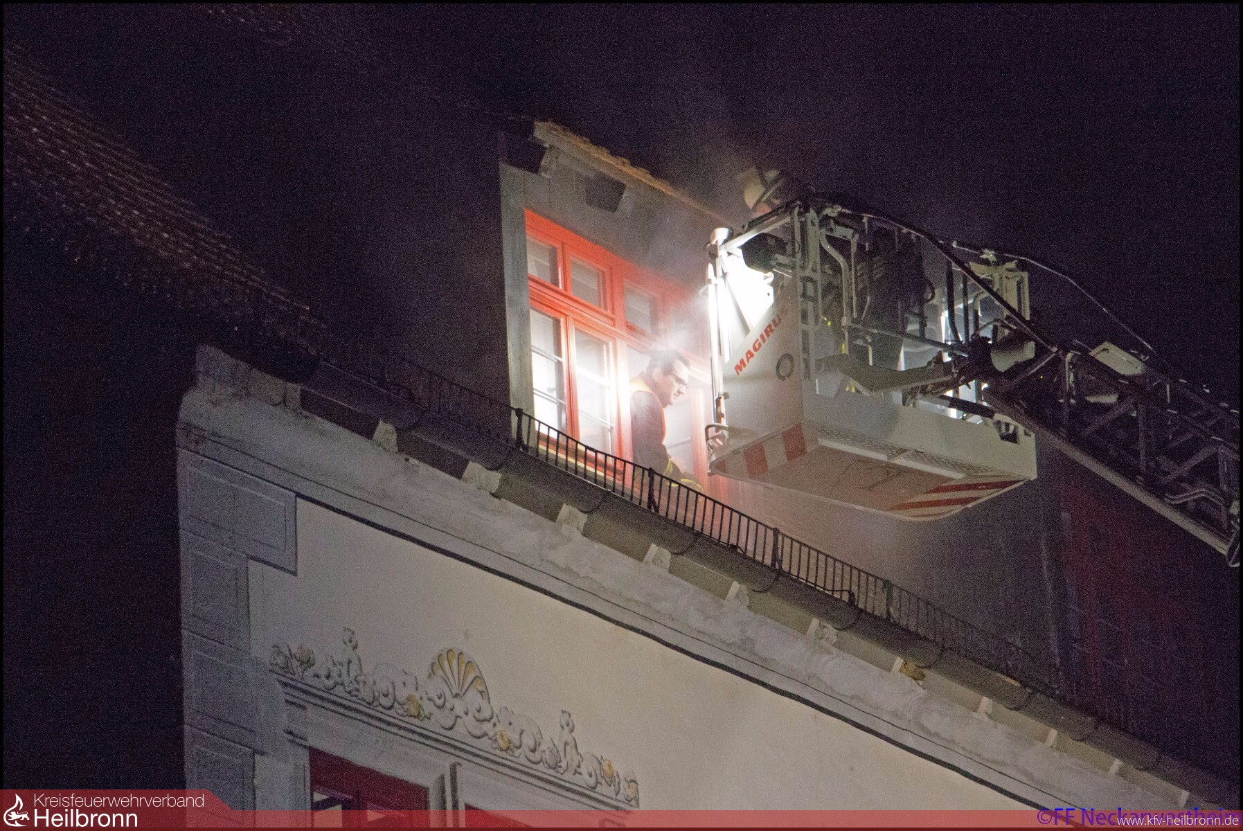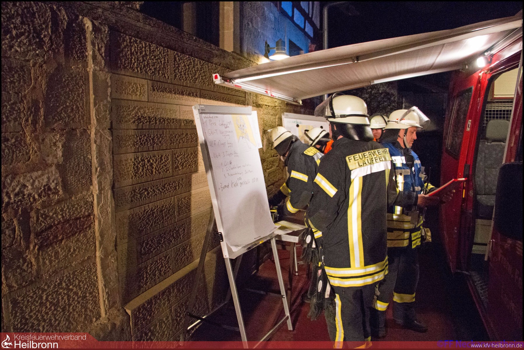 In der Zwischenzeit ist auch die Feuerwehr Lauffen eingetroffen. Sie übernimmt den Einsatzabschnitt im Innenhof. Die Drehleiter wird aufgestellt und beginnt mit der Personenrettung von den Dachgauben. Weitere Trupps gehen unter Atemschutz zur Brandbekämpfung ins Gebäude vor. Eine Person wird mit einer Fluchthaube nach draußen gebracht.