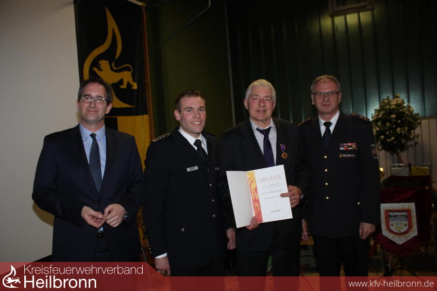 Reinhold Gall, der Vorsitzende des Kreisfeuerwehrverbands Heilbronn, verlieh dem ehemaligen Bad Rappenauer Oberbürgermeister die Auszeichnung während der Hauptversammlung der Einsatzkräfte.