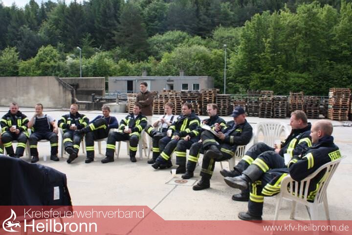 Nach einem weiteren Durchgang im Container, freuen wir uns auf das leckere Mittagessen. Beim Essen wird natürlich über das erlebte nochmals diskutiert. Auch Herr Gräßle informiert sich bei den Teilnehmern über die gesammelten Eindrücke und ist sichtlich fasziniert.Gestärkt vom Mittagessen bereiten wir uns auf den anspruchsvollsten Durchgang vor. Es gilt eine Rauchgasdurchzündung im Container mittels Strahlrohreinsatz zu blocken. Da 14 Teilnehmer im Container waren heißt es 28 Durchzündungen aushalten – Anstrengend!Die zur Verfügung gestellten Getränke sind anschließend sehr begehrt. Darauf achteten die Ausbilder ganz besonders, viel Trinken!