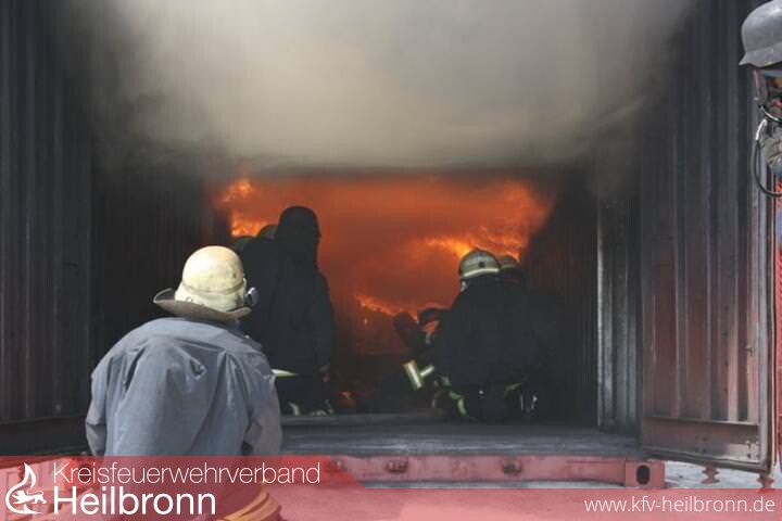 Der „Türmann“ wie es die Ausbilder nennen, steuert den Brand und die entstehenden Rauchgase im vorderen Bereich des Containers. Nach kurzer Zeit hängt ein schwarzer Rauchvorhang von der Decke. Uns bleibt etwa 1 Meter Platz, immer auf den Knien. Die Hitze steigt. Dann wird der Brandraum durch den Ausbilder verschlossen. Kurze Zeit später öffnet er dann die Türe erneut. Man kann kurzzeitig die Glut erkennen, der Brand ist fast erstickt. Durch den zugeführten Sauerstoff entzündet sich schlagartig der im Container befindliche Brandrauch und läuft als Feuerwalze über unsere Köpfe hinweg.Trotz den Atemschutzmasken ist den Kameraden ein leichtes Grinsen anzusehen. Auch der Bürgermeister und die zuschauenden Gäste außerhalb des Containers sehen die Durchzündung aus sicherer Distanz.Hier ist zu erwähnen, dass die Gemeinde Talheim 2008 neue Schutzkleidung für die Atemschutz-geräteträger angeschafft hat. Diese schützt den Feuerwehrmann genau bei solch einer Rauchgas-durchzündung vor schweren Verbrennungen.