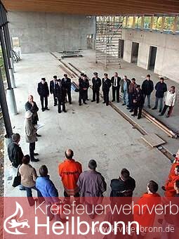 Gut 40 Floriansjünger waren der städtischen Einladung gefolgt und ließen sich von Bauamtsleiter Edwin Gohm in die Details des Bauwerks einweisen. Zunächst einmal stand man in der 300 qm großen Halle, die Platz für 5 Fahrzeuge bietet. Die nach Norden ausgerichteten Zufahrten werden mit so genannten Drehfalltoren verschlossen, die dreiteilig und mit einem separaten Öffnungsflügel montiert werden. Vor dem Hallenteil wird ausreichend Platz zum Fahrzeug-Rangieren sein.