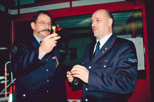 Bild: Der ehemalige Kommandant Rudolf Schuster (links) übergibt dem neuen Kommandanten Hartmut Schaffroth den Generalschlüssel. (Foto: Waltraud Langer)