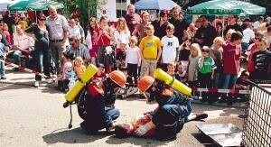 Das taten die Damen und Jugendlichen natürlich gerne. Mit Blaulicht und Martinshorn kam die Einsatzgruppe zum Einsatzort am Gerätehaus, wo wegen eines undichten Gefahrstoffbehälters schon ein erster Verletzter auf der Straße lag. Rasch wurde die Lage erkannt, dem Verletzten geholfen, die Schächte zu den Abwasserkanälen abgedichtet, und natürlich wurde auch mit der Schaukanone gespritzt. Zum Glück schien die Sonne auf den Festplatz, denn es wurden nicht wenige Gäste ordentlich nass. Für die Jugendwehr und damit für die Feuerwehr war diese Vorführung auf jeden Fall eine vorbildliche Werbung.