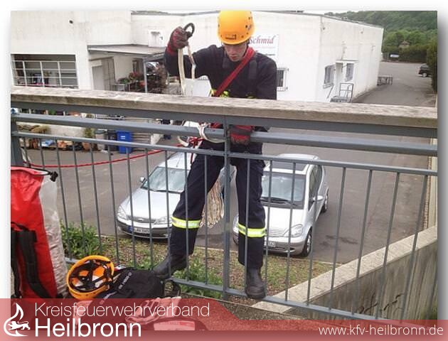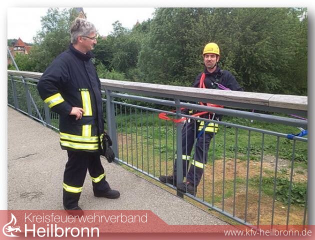 Danach folgte die wichtige Knotenkunde und im Anschluss daran begann der praktische Teil an diesem Tag. An einem Fußgängersteg über die Seckach übten die Feuerwehrkameraden den Einstieg, die praktische Handhabung, die Sicherung und vor allen Dingen das eigene Vertrauen in die Technik, entlang an einem Geländer.