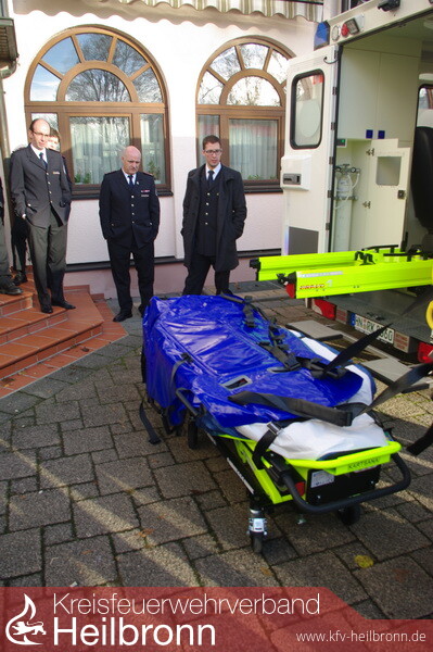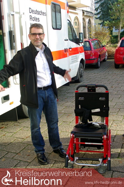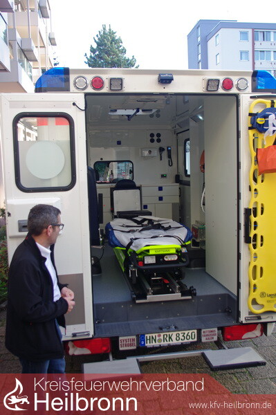 Am Sonntag stellte das DRK Heilbronn den dieses Jahr neu in Betrieb genommen Schwerlast RTW vor. Bei schwergewichtigen Patienten ist die in einem normalen RTW vorhandene Trage oftmals zu schmal und die Sicherungsgurte sind zu kurz. Das neue Fahrzeug ist wie ein Standard RTW ausgestatten, verfügt darüber hinaus jedoch um diverse Zusatzausstattung. Dazu gehört eine hydraulische Schwerlasttrage (bis 300 Kg belastbar), ein Raupenstuhl (bis 227 Kg belastbar) mit dem gerade Treppen befahren werden können sowie ein Gleit-Rettungstuch (belastbar bis 350 Kg), mit dem man Patienten auf Treppen nach unten rutschen kann. Üblicherweise rückt bei Einsätzen immer zuerst ein RTW aus, der Schwerlast-RTW wird bei Bedarf nachgefordert.