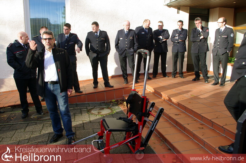 Kreisbrandmeister Uwe Vogel ging auf das Sonderlöschmittelkonzept ein. Ziel ist es, ein bedarfsorientiertes Netz von hocheffektiven Löschmitteln aufzubauen. Angedacht ist dabei, dass kleiner Mengen vor Ort vorhanden sind und bei Bedarf auf größere, zentral gelagerte Mengen zugegriffen werden kann. Diese Konzept soll unterstützten, um auf die unterschiedlichsten Situationen reagieren zu können. Der Grundschutz wird immer von den örtlichen Feuerwehren, in der Regel über die Fahrzeugbeladungen, abgedeckt. Größere Mengen an Sonderlöschmitteln (Schaummittel und Pulver) werden derzeit auf dem Abrollbehälter (AB) Sonderlöschmittel der Feuerwehr Heilbronn und den TroTLF der Werkfeuerwehr Kolbenschmidt (Neckarsulm) und der FBS (Untergruppenbach) vorgehalten.