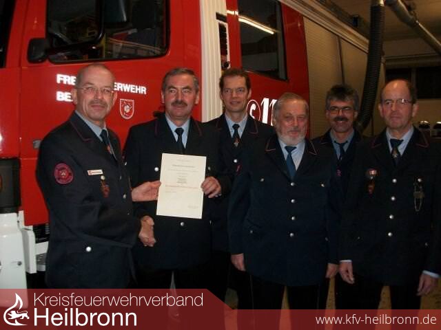 Für ihre Verdienste bekamen Edgar Rupp und Ernst Kawa die Ehrenanstecknadel des Kreisfeuerwehrverbandes angeheftet. Bei den Ehrungen wurde Ernst Kawa außerdem mit der Ehrenmitgliedschaft in der Beilsteiner Wehr und dem Ehrenkreuz in Gold des Landes Baden-Württemberg ausgezeichnet. Das Ehrenkreuz in Gold für 40 Jahre Feuerwehrdienst erhielt außerdem der stellvertretende Abteilungskommandant der Abteilung I, Edgar Rupp, überreicht. Rainer Heidinger, Uwe Hermann, Gerald Schäfer und Wilfried Scharpf erhielten für 25-jährige Mitgliedschaft das Ehrenkreuz in Silber.