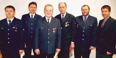 Bild: Manfred Rebstock und Helmut Ott (Dritter und Vierter von links) wurden von Frieder Lieb (Zweiter von links) und Heiner Schiefer (Zweiter von rechts) mit dem goldenen Feuerwehrehrenzeichen ausgezeichnet. Auch Kommandant Werner Bauer (links) und Bürgermeister Thilo Michler gratulierten. (Foto: Werner Stuber)