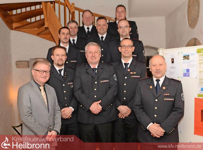 Bild: Die Führung der Möckmühler Feuerwehr und ihrer Abteilungen ist komplett und von Bürgermeister Ulrich Stammer (links) verpflichtet worden.Foto: Rudolf Landauer