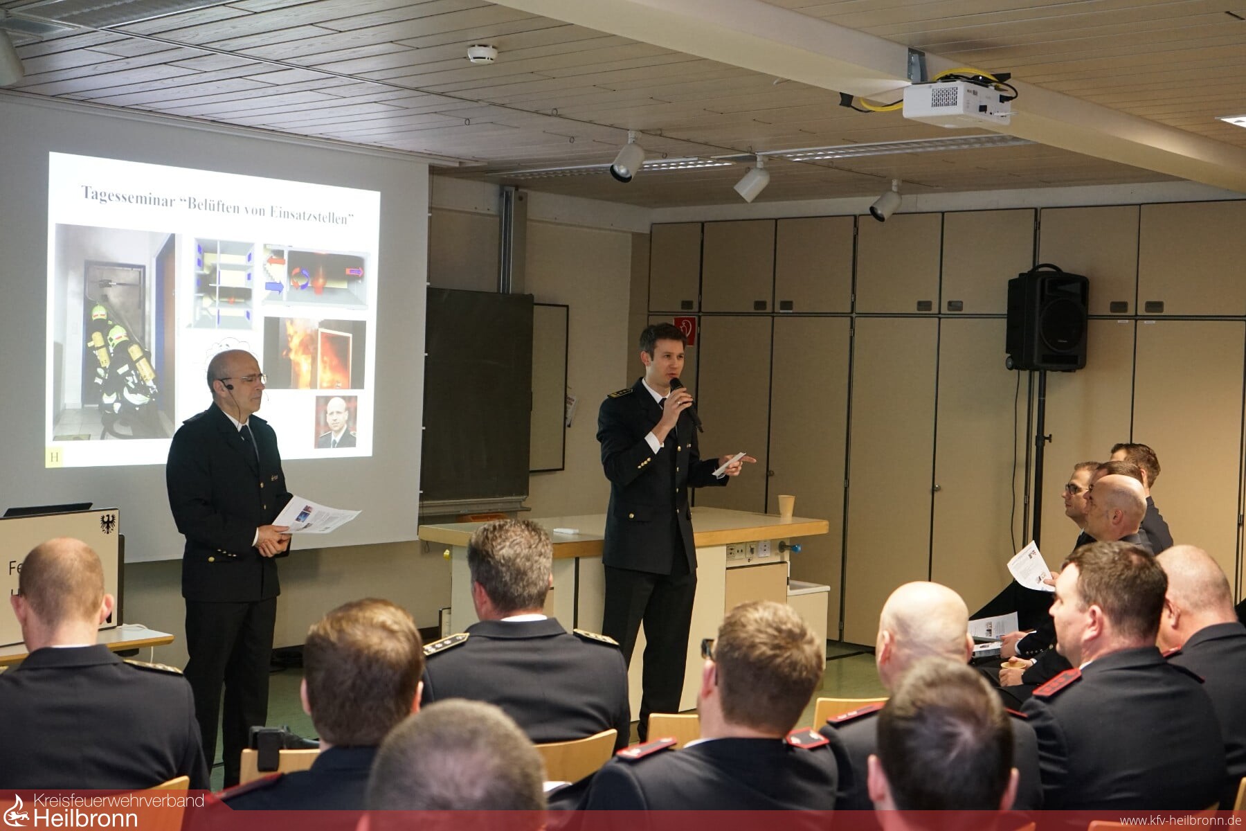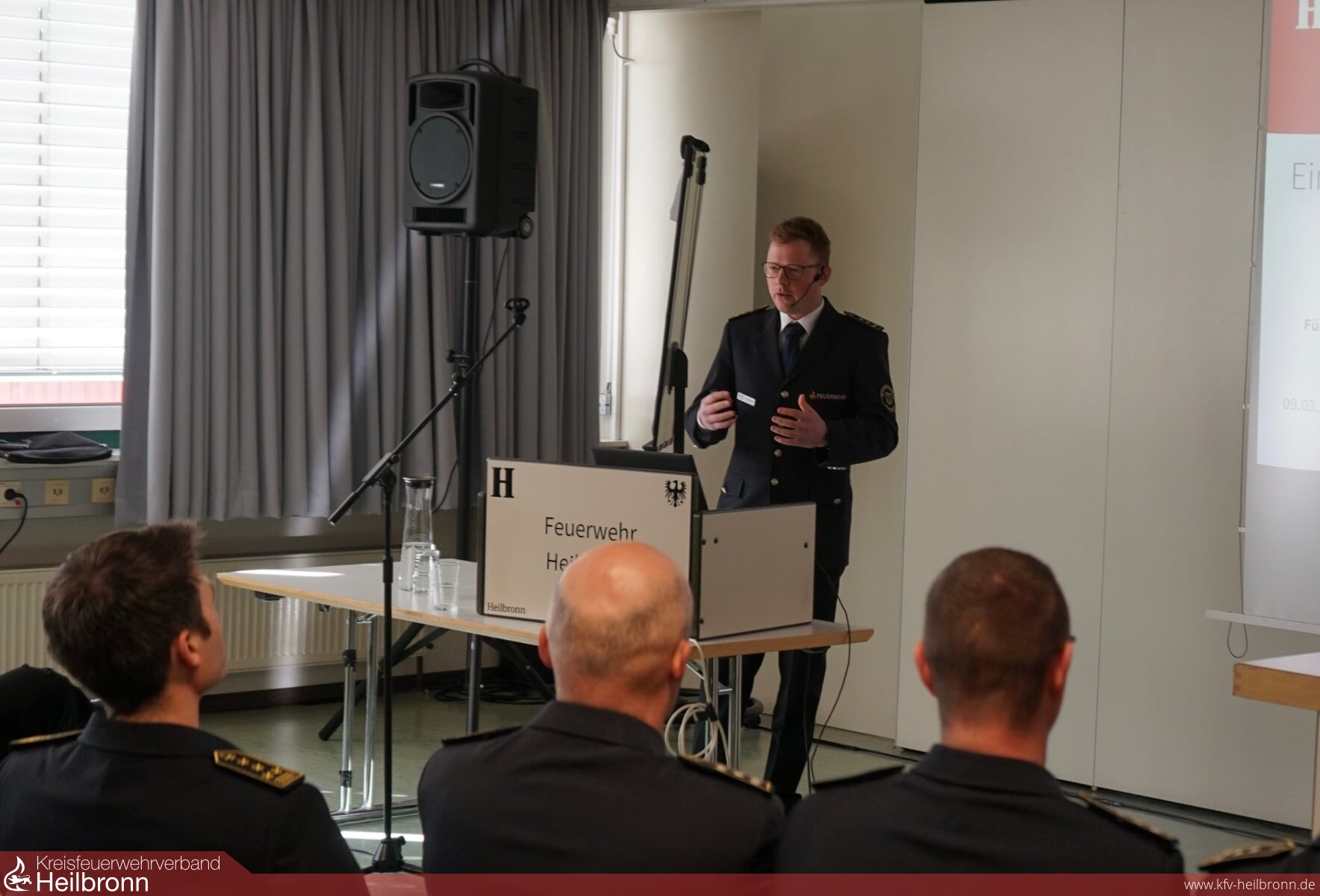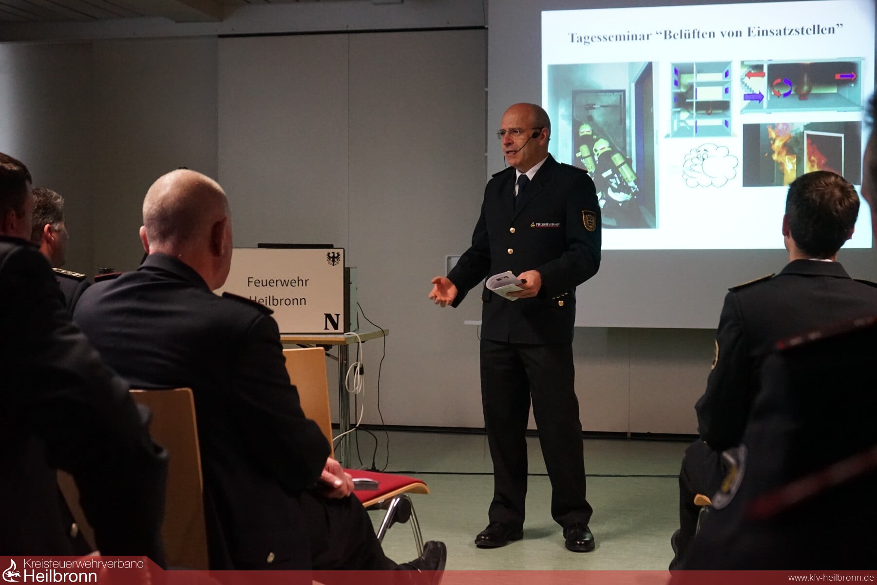 Rund einhundert weibliche und männliche Führungskräfte der Feuerwehr Heilbronn bildeten sich am gestrigen Samstag bei einem Tagesseminar auf der Hauptfeuerwache weiter. Nach der Begrüßung durch den Feuerwehrkommandanten, Fabian Müller, führte Prof. Dr.-Ing. Michael Reick durch das Programm. Michael Reick ist seit 1999 Kreisbrandmeister im Landkreis Göppingen und darüber hinaus auch als Brandschutzsachverständiger tätig. Mit ihm konnte eine international bekannte Koryphäe im Bereich des baulichen Brandschutzes sowie in der rechnerischen Brandsimulation gewonnen werden. Zusammengefasst unter dem Thema „Belüften von Einsatzstellen“ referierte er in erster Linie über die richtige, taktische Ventilation bei Brandeinsätzen. In zahlreichen Beispielen demonstrierte Reick die gravierenden Folgen, welche bei falscher Vorgehensweise entstehen können.