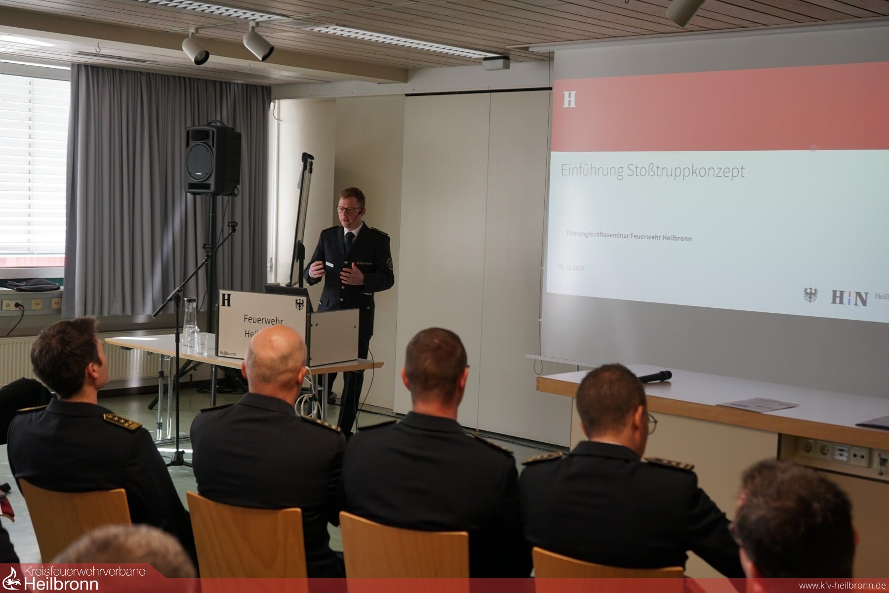 Besondere Einsatzstellen wie z.B. Hochhausbrände erfordern besondere Vorgehensweisen. Zu diesem Thema führte unser Kollege Conrad Wagenbach vom Sachgebiet „Einsatzvorbereitung“ weiter durch das Seminar. In seiner Präsentation verdeutlichte er das taktische Vorgehen von Stoßtrupps, die bei besonderen Lagen auch bei der Feuerwehr Heilbronn zum Einsatz kommen. Solche Einheiten werden aus einer Führungskraft sowie zwei voll ausgerüsteten Trupps gebildet und gehen gemeinsam zur Menschenrettung und Brandbekämpfung vor.