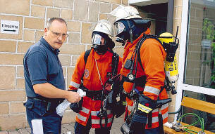 Bild: Dieter Renner (links) gibt den Atemschutzträgern Jan Massa und Matthias Maier letzte Anweisungen für den Erkundungseinsatz. (Foto: Gustav Döttling)
