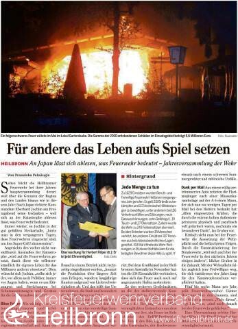 Selten blickt die Heilbronner Feuerwehr bei ihrer Jahreshauptversammlung derart weit über die Grenzen der Region und des Landes hinaus wie in diesem Jahr: Nach Japan richtete Kommandant Eberhard Jochim am Freitagabend seine Gedanken - weil sich an der Katastrophe ablesen lässt, was Feuerwehr bedeutet.